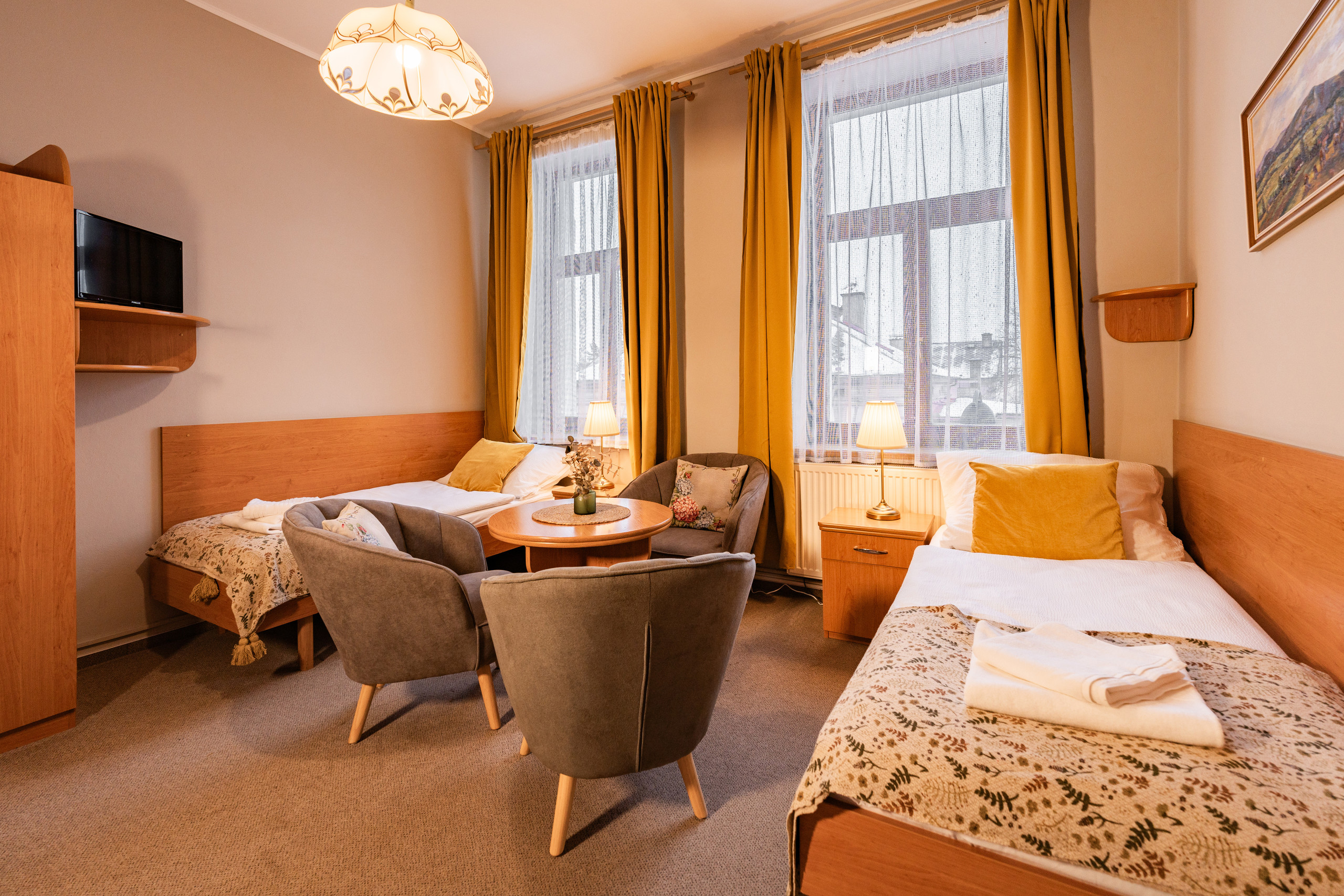 Dvoulůžkový pokoj v prvním patře s výhledem do boční ulice.