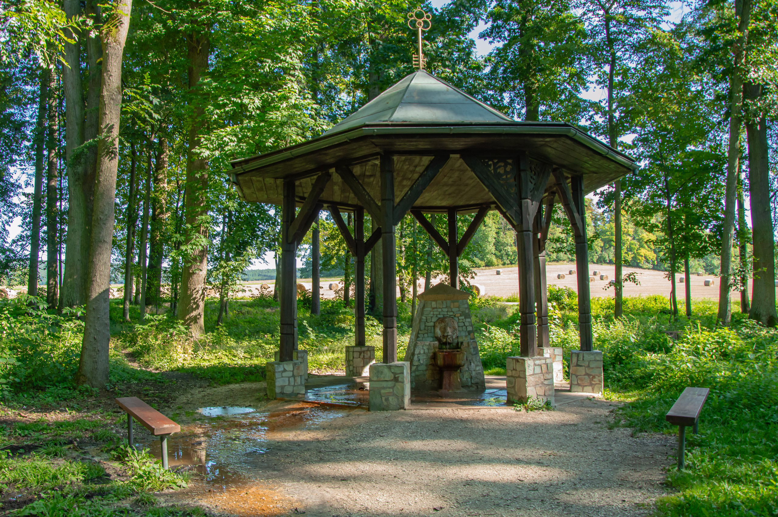 Za lázeňskými budovami začíná rozlehlý lesopark Bažantnice na jehož konci najdete pramen Vitality.